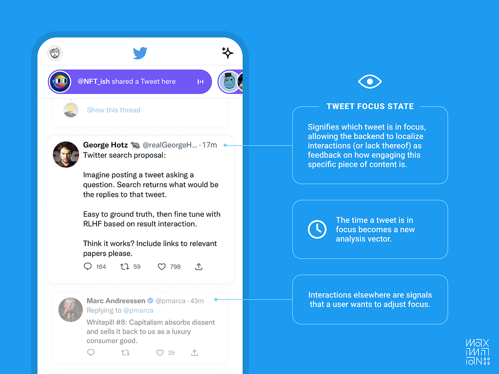 This thinking can be applied to Twitter's core component by introducing a focus state to Tweets. Enhancing backend visibility of how engaging any specific tweet is can drastically enhance the quality of future tweet recommendations. While this change does add friction to the user experience by slowing down the scroll mechanism, the longterm benefits can easily make the tradeoff worth it.