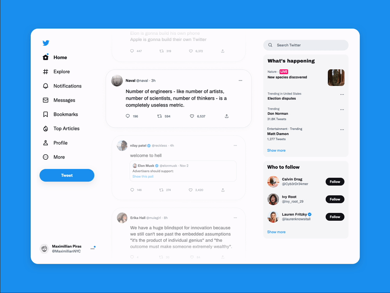 It seems like every platform is copying TikTok's interface& there's a good reason. TikTok's success lies in its efficiency for training recommendation algorithms. This is thanks to the clarity with which its interface defines where a user is focusing. A notion of focus enables the backend to localize interactions (or lack thereof) to specific content as measures of quality. I've discussed this in depth in an article called Designing Algorithm-friendly Interfaces, so I'll skip the technical details here. The upshot is that since social media platforms only succeed by engaging users with relevant content, algorithmic efficiency is a massive advantage. So what would happen if Twitter took a similar approach?